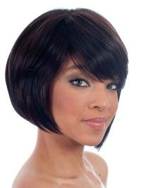 An asymmetrical bob with side swept bangs. This cute bob style has full bangs that you can change the direction of as if it were your natural hair!