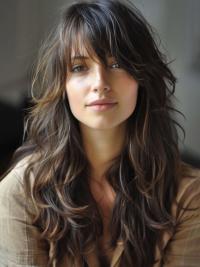 Soft waves, long length, and a sweet fringe make it cozy-chic.