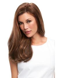 Designed with the comfort of a 100% hand tied stretch base, this long Remy human hair volumizer is worn over the entire crown, providing the most coverage of any clip in topper.