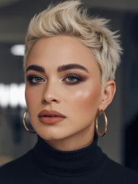 There is a brief textured blonde cut that is vibrant with the movement. Not only is it cropped but is layered and messed up in a manner that is playful and dynamic.