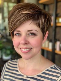 This pixie cut is designed to maximize volume for fine hair. The longer top layers can be styled for height and fullness, while the shorter sides keep the look neat and manageable. Soft highlights add dimension, making this an ideal cut for fine hair that needs a little extra body.