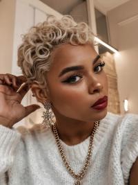 This is a sculptural, sleek and completely memorable short cropped cut. The platinum blonde curls are in a tidy definition and they enhance the curve of the head and the daringness of the appearance.