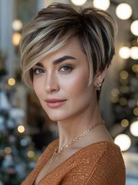 This haircut takes the pixie and adds the warmth with a subdued blonde highlights mixed with deeper roots. It is stacked in such a way as to make it appear fuller, with longer strands that sweep over the face in the front to make them feminine.
