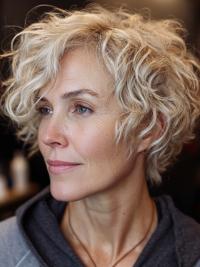 A choppy cropped shag with tousled curls and feathered ends in a natural sandy blonde. Lightweight and freeform, perfect for effortless edge.
