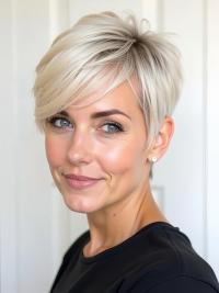This stunning short pixie haircut exudes a blend of elegance and playfulness, making it a perfect choice for women seeking a fresh, modern look. With its soft, tousled layers and striking blonde hue, this hairstyle enhances facial features beautifully, offering a youthful vibe.