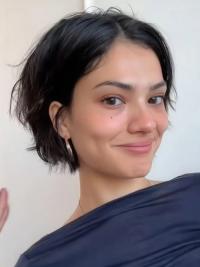 A dark color shaggy and layered short bob with bottleneck bangs is a bold and catchy idea.