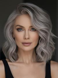 This stunning silver bob haircut features soft, loose waves that add texture and volume to the style. The soft waves add movement, while the silver hues bring a touch of elegance.