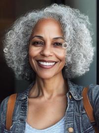 She has a big, gray, curly afro. The soft, bouncy ringlets create a pretty shape around her face.