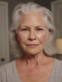 Her hair is soft and silver, falling to her shoulders with light layers that nicely shape around her face.