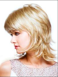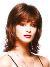 This is a new, irresistible straight medium length wig. The lapel length layered turn over with genuine natural edges. It features feathery, out-flipped layers with light wispy bangs.