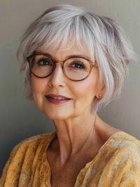 She has a stylish short haircut with layers. The ends are softly feathered, and there are light, wispy bangs that nicely frame her face.