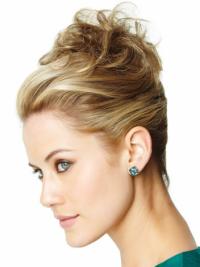 If your updo has a drawstring, pull both draw strings until the piece is secured to your own hair. Tie strings together and tuck them inside your updo.