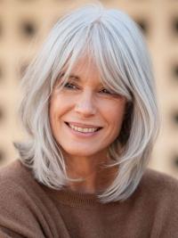A layered silver bob with bangs is playful and youthful. The bangs frame the face, while the textured ends add a trendy and effortless touch.
