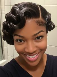 A vintage-inspired finger wave style that hugs the scalp with intricate waves, showcasing the timeless beauty of ebony-colored hair.