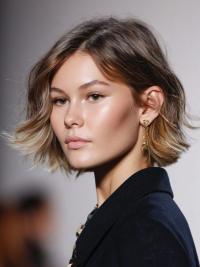 The balayage short wavy bob is a hairstyle that combines color and texture. The balayage technique adds depth and dimension to the hair, while the waves bring movement and life. It gives a natural, sun-kissed look with a bit of playfulness.