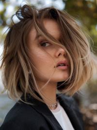 This textured bob haircut that embodies effortless chic and playful sophistication. The tousled, shoulder-length bob features a blend of warm tones that add depth and dimension, perfectly framing her face.