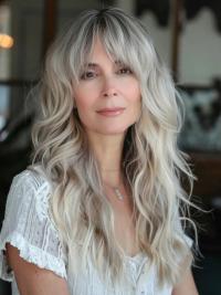 With bangs paired with long waves create a soft, ethereal look. The hue adds luminosity, while the waves offer movement, giving a polished, beachy style that’s perfect for older women.