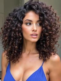 These curls are beautifully highlighted to enhance the natural curl pattern and add depth to the hair. The medium brown curls are cut with layers that start at the chin, allowing the curls to spring naturally and create a voluminous silhouette.