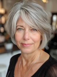 A chic bob cut that is sleek and modern.This timeless style is both stylish and easy to maintain, offering a polished look that highlights the beauty of gray hair.