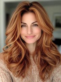 Draped, face-framing layers bring softness and elegance, paired with a maple glaze color that mixes amber and golden brown tones for warmth and shine.